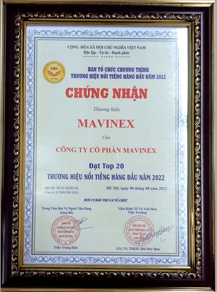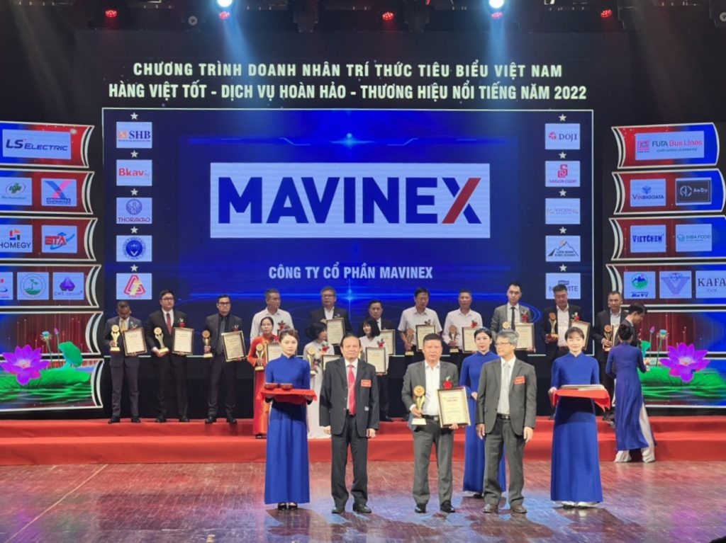 Ngày 6/8/2022 tại Hà Nội đã diễn ra Lễ công bố và tôn vinh các doanh nghiệp đạt thương hiệu nổi tiếng hàng đầu năm 2022 do viện Kinh tế và Văn Hoá phối hợp với Trung tâm bảo vệ người tiêu dùng tổ chức. Tại Lễ trao giải, Công ty Cổ phần Mavinex đã được vinh danh trong Top 20 thương hiệu nổi tiếng hàng đầu năm 2022.